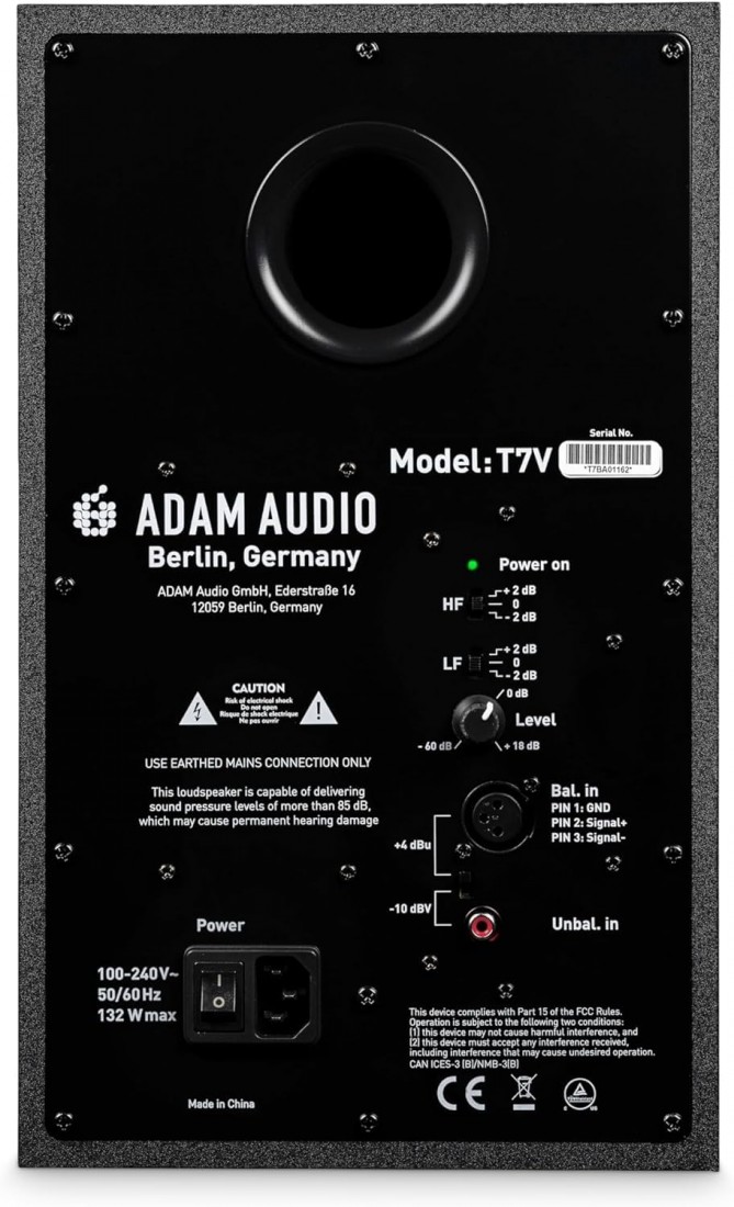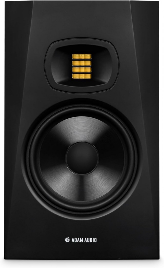 The T7V features a 7” woofer that provides bass extension down to 39 Hz, while the U-ART tweeter’s diaphragm provides pristine and extended high-frequency response up to 25 kHz – virtually unheard of in monitors in this price range. The U-ART tweeter is fitted to a precision waveguide with the same dispersion-control attributes as the High Frequency Propagation (HPS) waveguide used in ADAM Audio’s flagship S Series studio monitors. The waveguide’s highly uniform dispersion of high frequencies provides an incredibly wide sweet spot that frees you from being glued to a rigid mix position while working.