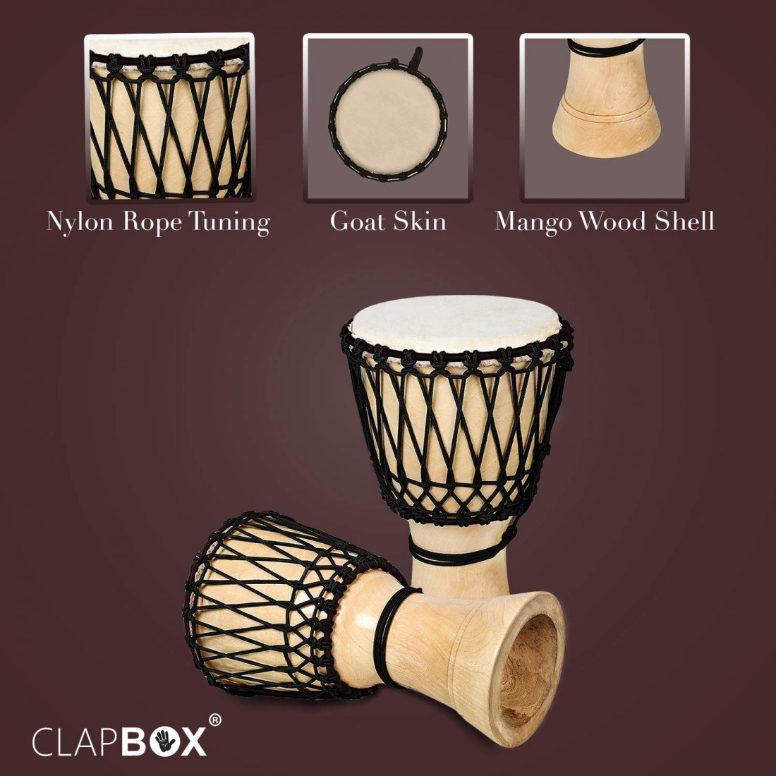 Hand-Selected Goat Skin Heads: Features premium goat skin heads that produce classic djembe sounds with a warm yet cutting tone. Play the center for boomy bass and the edges for sharp, popping accents.