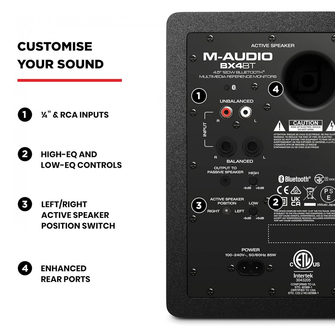 M-Audio BX4BT features Left/Right Active Speaker Position switch lets you choose which speaker is the Left or Right side. This is very useful if you are left-handed and want the speaker with the front panel volume control on your left side, or vice versa. Also on the rear panel are High-EQ and Low-EQ controls to boost the low end or add some shimmer to the highs.