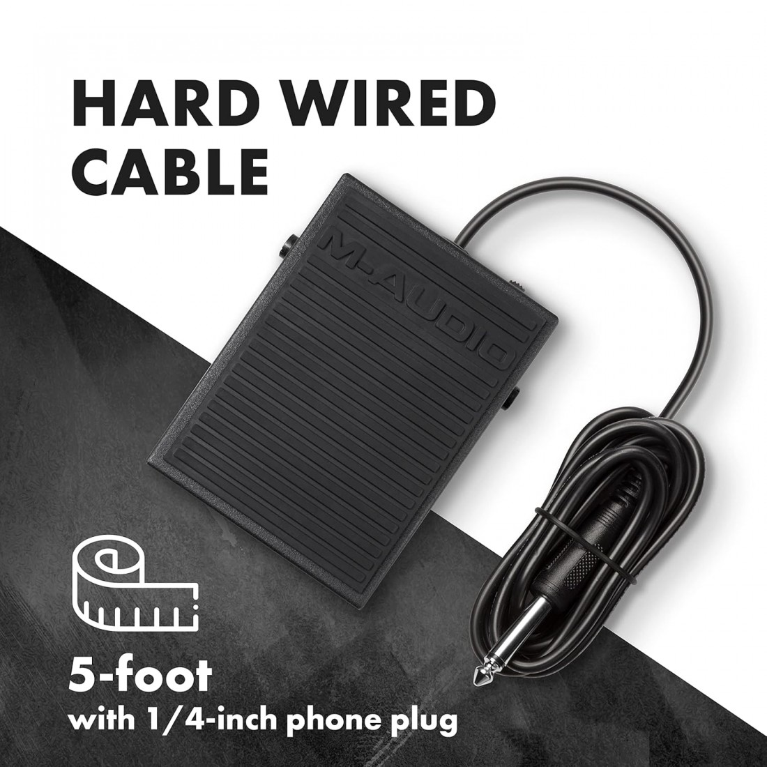 The pedal comes equipped with a 5-foot cable featuring a standard 1/4-inch (6.35mm) phone plug, allowing for immediate connection to virtually any keyboard or MIDI device with a sustain pedal input.