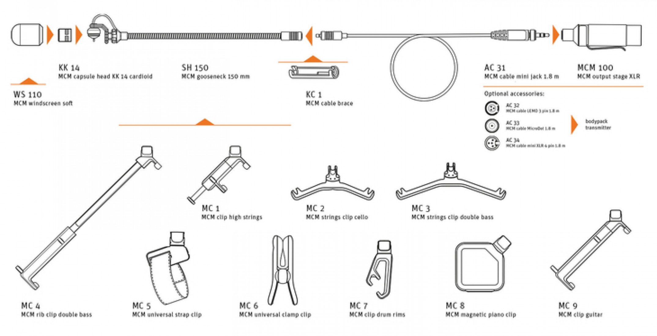 The MCM 114 Brass/Sax/Uni Set is engineered to handle the intense sound pressure and physical vibrations of wind and percussion instruments. The core of the system is the KK 14 electret capsule, which offers a level of tonal consistency and natural warmth previously unseen in miniature microphones. The set includes a flexible SH 150 gooseneck, the instrument-safe MC 6 universal clamp, a locking connection cable, and the MCM 100 XLR output stage for a complete wired professional setup.