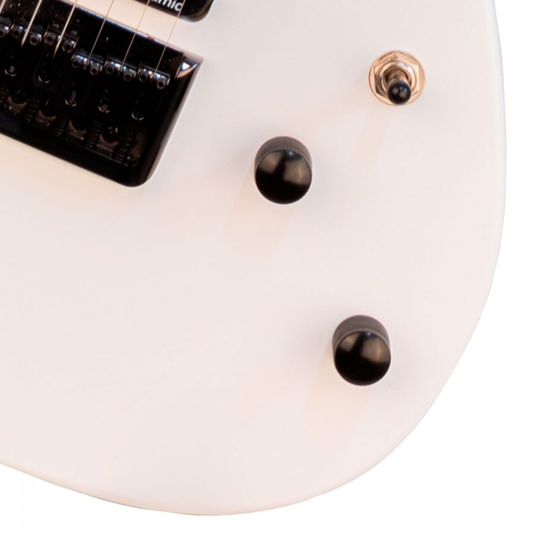 Contrast Black Hardware: To complete the modern aesthetic, every hardware component—including the bridge, tuners, and knurled control knobs—is finished in Satin Metallic Black. This provides a striking visual contrast against the White body and resists fingerprints during intense performances.